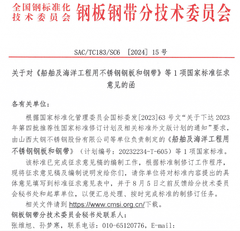 6月5日,由山西太鋼不銹鋼股份有限公司等單位負責制定的國家標準《船舶及海洋工程用不銹鋼鋼板和鋼帶》已完成征求意見稿的編制工作。