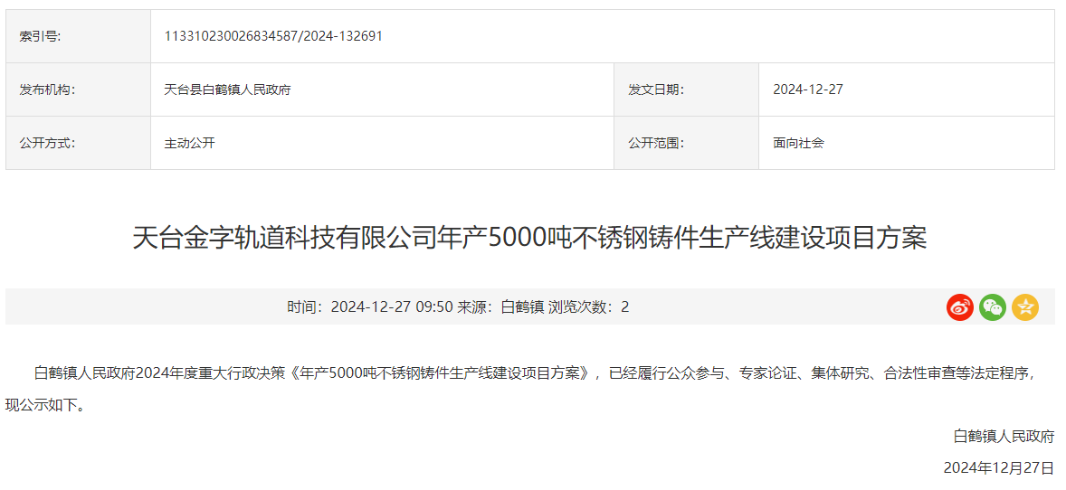 2024年12月27日,白鶴鎮(zhèn)人民政府就天臺金字軌道科技有限公司年產5000噸不銹鋼鑄件生產線建設項目方案對外進行公示。